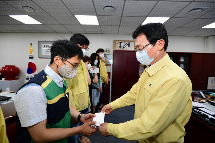 ▲이환주 시장이 시민들로 부터 칭찬받은 직원들을 격려하고 있다.(남원시 제공) |