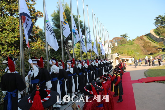 특히 과거 모양성 축성 당시 참여했던 전라남북도와 제주도 등 현존하는 17개 자치단체장이 한 자리에 모여 각 시군의 깃발을 고창읍성 광장에 마련된 게양대에 게양하는 올림행사를 가졌다.