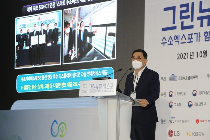 ▲허성무 시장이 6일 킨텍스에서 열린 ‘2021 그린뉴딜 엑스포’에 참가해 참석 내빈을 대상으로 ‘미래 수소사회 선도를 위한 창원의 도전과 과제’라는 주제로 민선7기 동안 창원시가 추진한 수소정책의 성과를 발표하고 있다. 창원시 제공 |