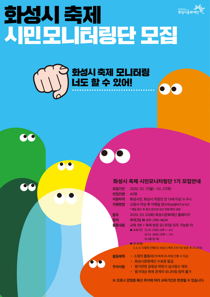 모니터링단은 다양한 축제에 관심이 많고, 적극적인 자세로 축제에 참여하고, 활동 할 수 있는 만 19세 이상의 화성시민이라면 누구나 지원 가능하다.