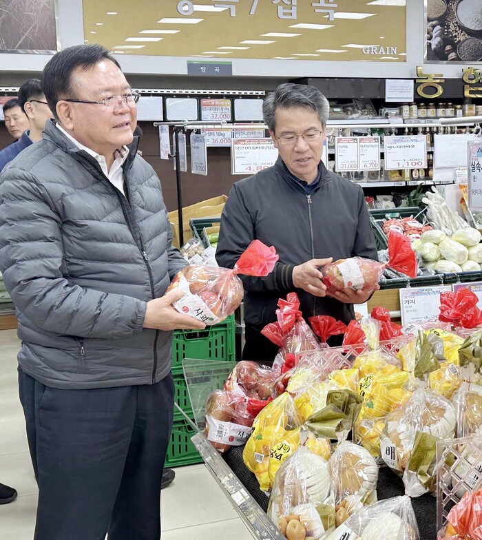 ▲박서홍 신임 농업경제대표이사(오른쪽)와 남서울농협 안용승 조합장(왼쪽)이 남서울농협 관내 하나로마트를 방문하여 농축산물 특별 할인행사 현장을 순람하고 있다. |