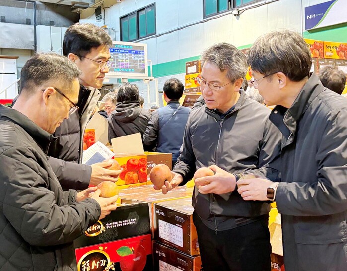 ▲농협경제지주 박서홍 신임 농업경제대표이사(오른쪽 2번째)가 취임 첫 행보로 농협 가락공판장을 찾아 사과 등 주요 농산물의 수급상황을 점검하고 있다. |