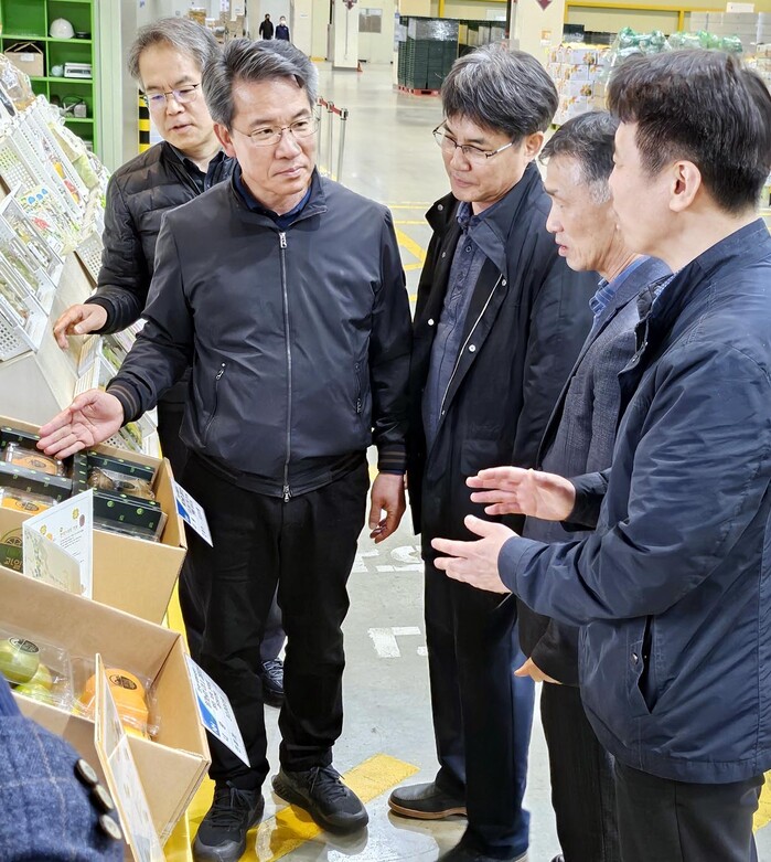 ▲박서홍 신임 농업경제대표이사(왼쪽 2번째)가 안성농식품물류센터를 찾아 농협 우수 농산물에 대한 설명을 듣고 있다. |