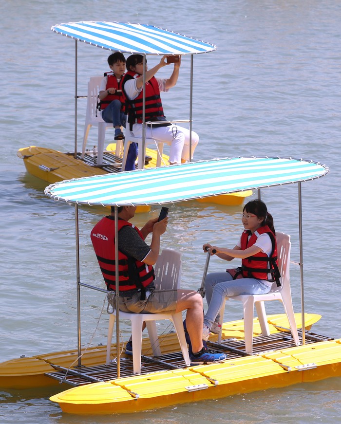| ▲오늘의 포토제닉상은 누구? 2017 화성 뱃놀이 축제에 온 관광객들이 해상체험을 하며 사진 찍기에 열중하고 있다. |