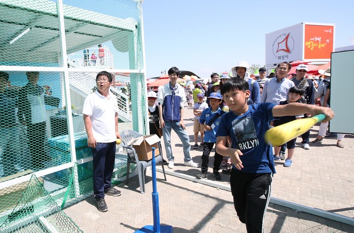 | ▲2017 화성 뱃놀이 축제를 찾은 아이들이 국내 최대 유소년 야구장 ‘화성드림파크’야구체험에 푹 빠져 신나게 배트를 휘두르고 있다. |