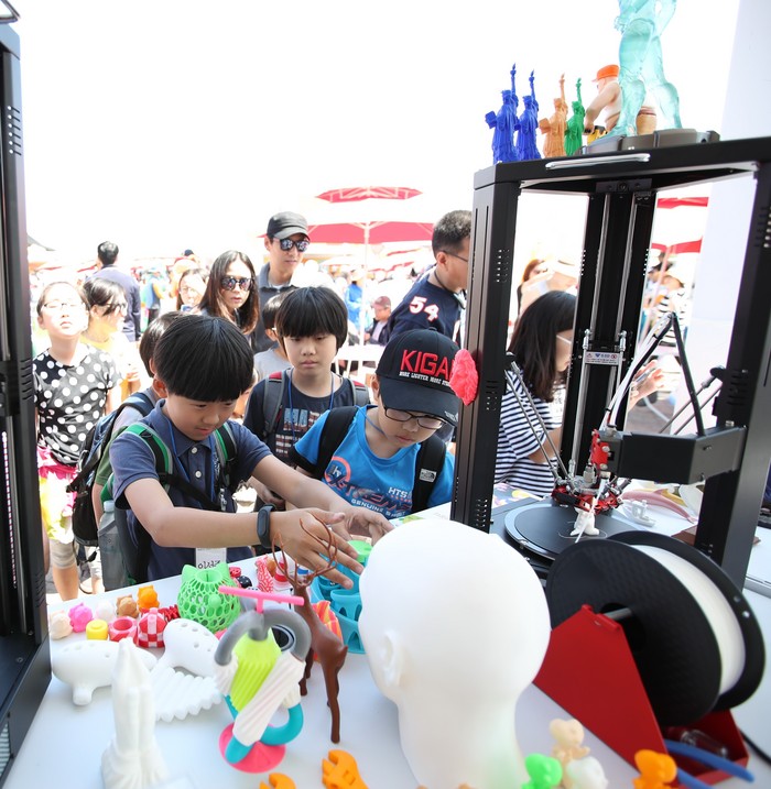 | ▲2017 화성 뱃놀이 축제를 찾은 아이들이 화성시 학교 복합화 시설 ‘이음터’홍보부스에서 ICT 특화 프로그램인 3D프린터를 체험해보고 있다. |