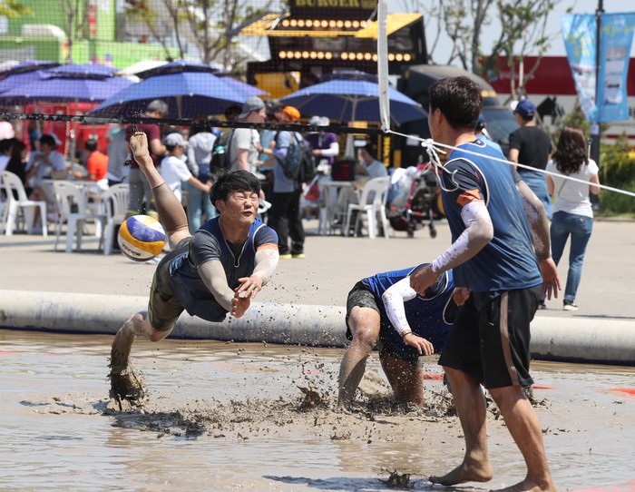 | ▲2017 화성 뱃놀이 축제에서 열린 머드 발리볼대회에 시민들이 온 몸을 던지며 명승부를 펼치고 있다. |
