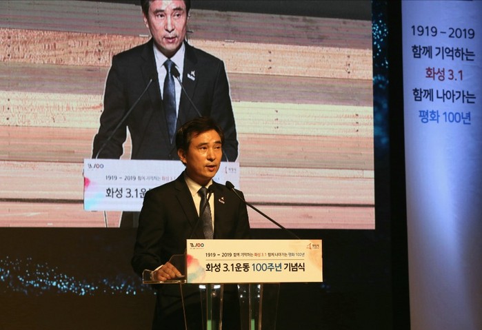 | ▲유앤아이센터에서 열린 화성3.1운동 100주년 기념식에서 서철모 화성시장이 기념사를 하고 있다. |