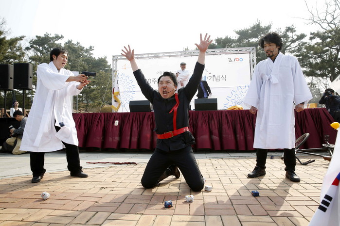 | ▲송산면에서 열린 100주년 기념식에서 재현행사로 진행된 일본순사 노구치 처단 모습. |