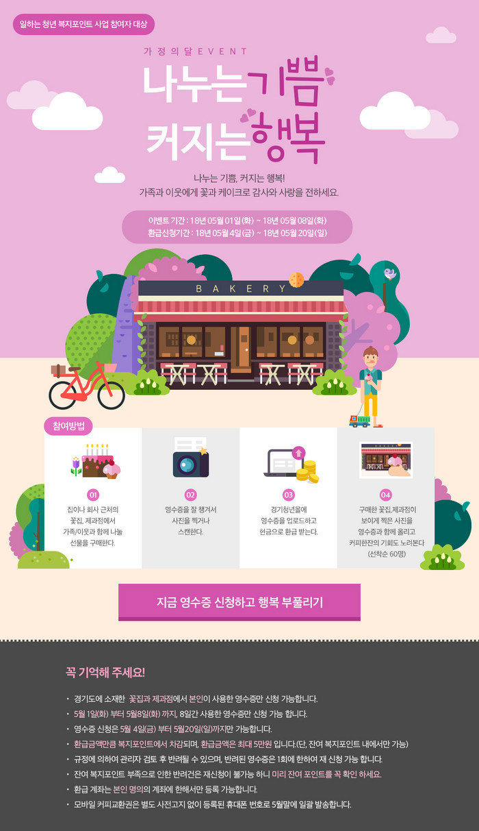 내달 1일부터 8일까지 복지포인트 참여자가 도내 소재 꽃집, 제과점을 이용하고 ‘경기청년몰’에 차감 신청을 할 경우 최대 5만원까지 개인계좌로 환급받을 수 있다.