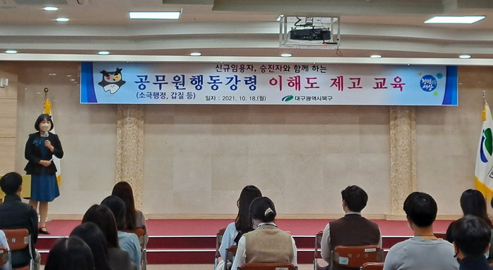 [로컬세계 박세환 기자]대구 북구청은 18일 구청 4층 대회의실에서 신규 임용자와 승진자 130명을 대상으로 2회에 걸쳐 공무원행동강령 교육을 실시했다.