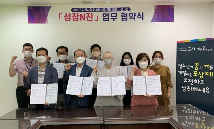 한편, 수성구는 여성가족부가 주최하고 한국청소년정책연구원이 주관하는 ‘2022년 지역사회 청소년 성장지원 모델 시범사업’ 공개모집에 선정돼 수성구 청소년 성장지원 협의체인 ‘성장N진’을 구성 및 운영하고 있다.