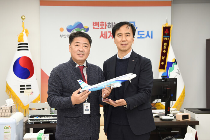 남구에 따르면 송오선 부산은행 대연동금융센터장은 지난 12일 BNK그룹 본사가 위치한 부산 남구를 방문, 오은택 청장에게 '2030부산세계박람회 유치'를 염원원하는 정성을 담은 대형 모형 항공기를 증정했다.