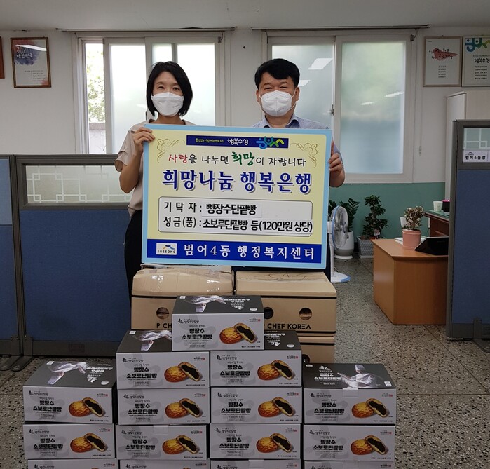 [로컬세계=박세환 기자] 대구 수성구 빵장수단팥빵(대표 박기태)은 26일 중복을 맞아 어르신들께 전해달라며 소보로단팥빵 400개(120만원 상당)를 범어4동 행정복지센터에 전달했다. 이날 전달된 단팥빵은 경로당 3곳에 전달될 예정이다.