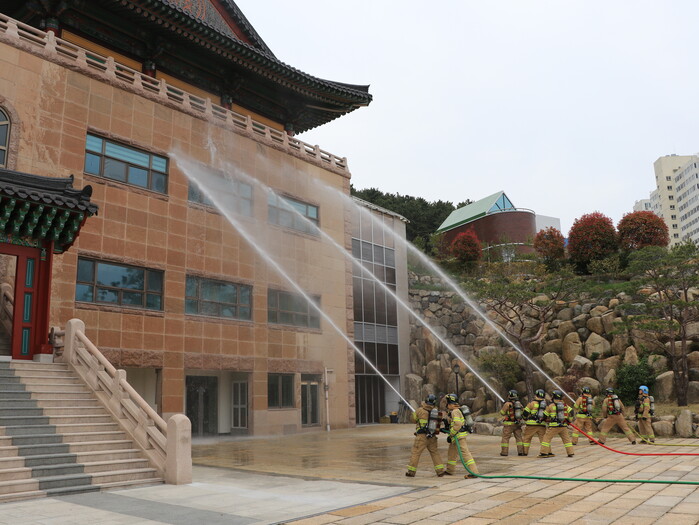 [로컬세계 부산=맹화찬 기자]부산 항만소방서는 지난 8일 영도구 동삼동에 위치한 한마음선원 부산지원에서 소방공무원 18명과 소방차량 4대를 동원해 소방차 진입 곤란지역을 가정한 다관창 중계 방수훈련을 실시했다고 밝혔다.