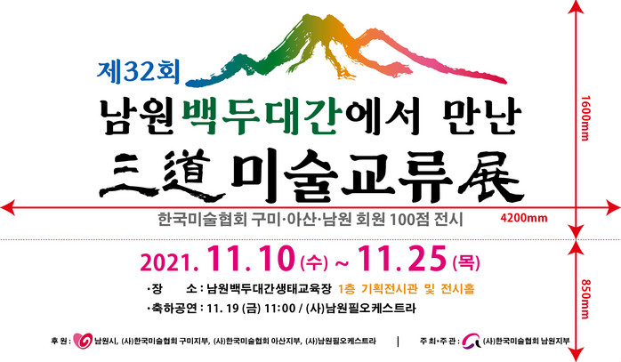 사단법인 한국미술협회 남원지부 주최하고 남원시가 후원하는 이번 전시회는 3개 지역 미술협회 회원 100명이 참가해 회화, 공예, 조각 등 작품 100점을 선보이며, 본 행사의 개관을 축하하기 위해 필하모니오케스트라가 11월 19일(금) 공연할 예정이다.