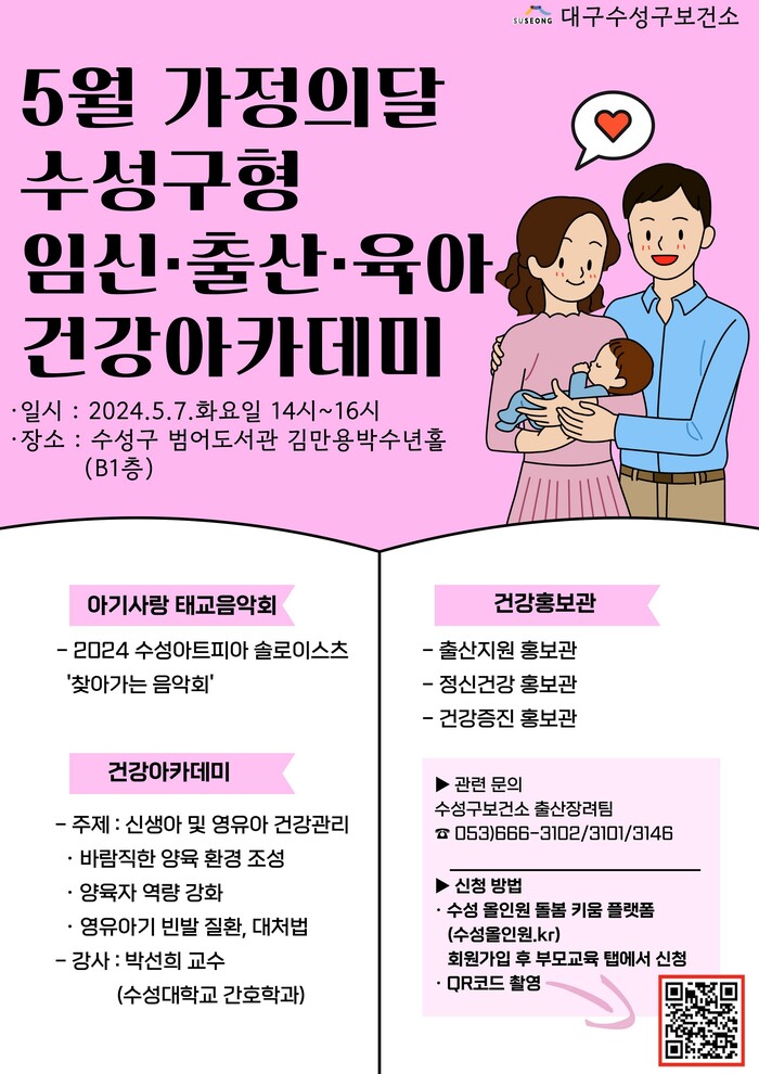 [로컬세계=박세환 기자] 대구 수성구는 다음 달 7일 범어도서관 김만용박수년 홀에서 ‘수성구형 임신·출산·육아 건강아카데미’를 개최한다.