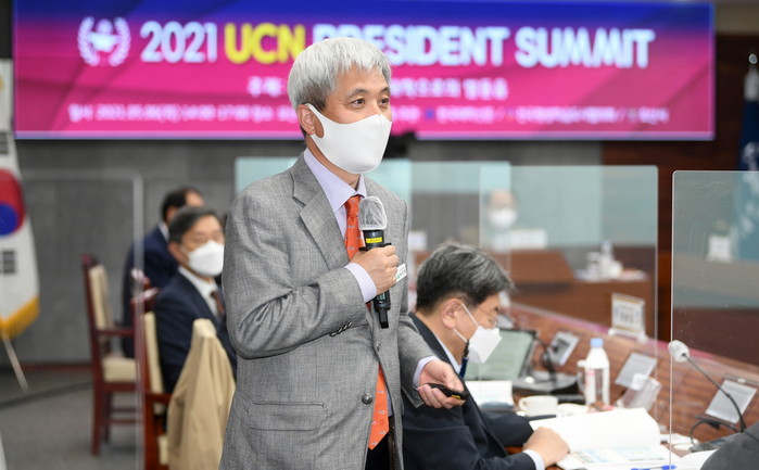 곽상욱 전국평생학습도시협의회장은 6일 오산시청 상황실에서 열린‘2021 전문대 UCN 프레지던트 서밋’제3차 컨퍼런스에서 「평생학습과 대학연계를 통한 지역사회 일자리창출 방안」을 주제로 강연했다.