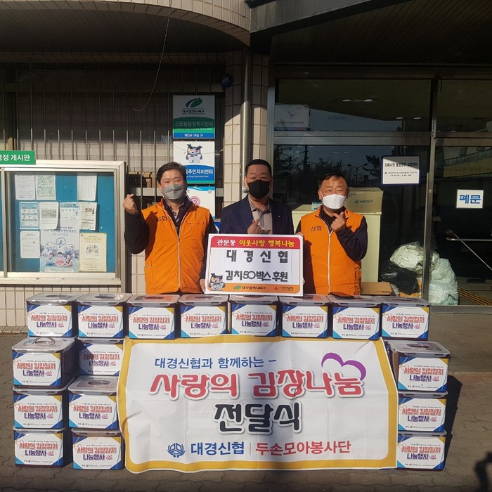 이수군 이사장은 “2021년 대경신협 두손모아봉사단에서 사랑의 김장 김치를 관문동에 지원하게 되어 기쁘게 생각하며 지역민의 도움으로 대경신협 금호사수점이 발전하게 되어 감사하게 생각한다”고 말했다.