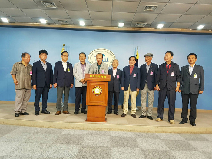 ▲정진권 삼척시의회 의장이 삼척지역 단체장들과 23일 국회 정론관에서 기자회견문을 낭독하고 있다.(사진제공=삼척상공회의소) |