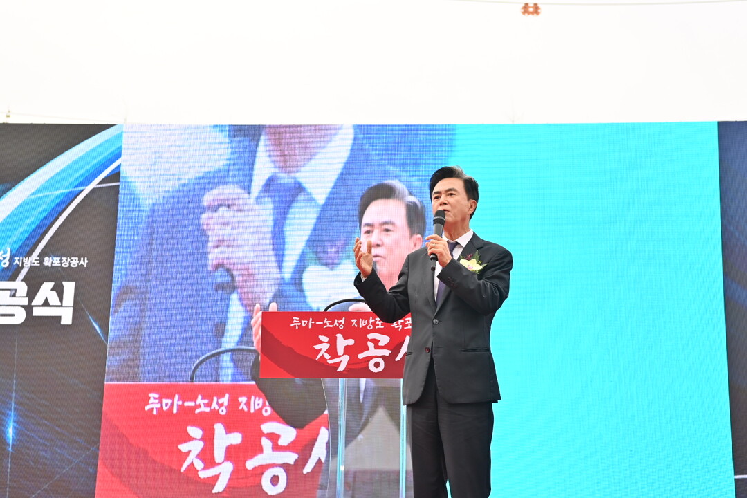 [로컬세계 = 박명훈 기자] 충남도가 계룡‧논산 주민들이 20년 동안 기다려온 동서축 도로망 구축에 본격 착수했다. 도는 30일 계룡시 종합운동장에서 김태흠 충남지사, 이응우 계룡시장, 백성현 논산시장, 윤길호 계룡건설산업 대표, 성우종 도원이앤씨 회장, 주민 등 300여 명이 참석한 가운데 지방도 645호선 두마-노성 확포장공사 착공식을 열었다.