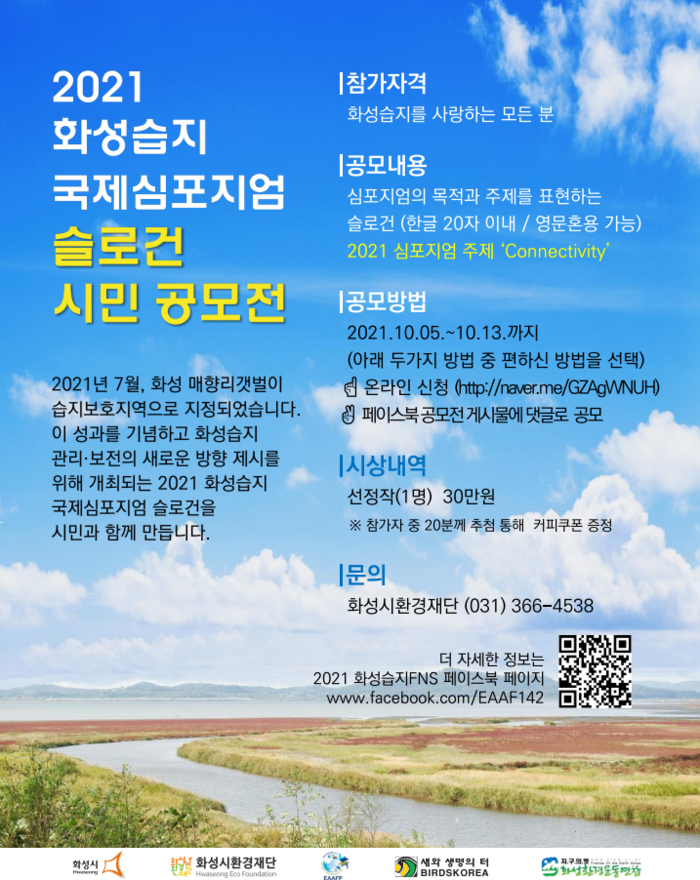 이번 ‘2021 화성습지 국제심포지엄 슬로건 시민공모전’은 화성습지가 지난 2018년 EAAFP의 네트워크 서식지로 등재되고 2021년 7월 매향리갯벌이 연안습지보호지역으로 지정되는 성과를 기념하고 ‘2021 화성습지 국제심포지엄’을 시민들과 함께 만들어 가기위해 마련됐다.