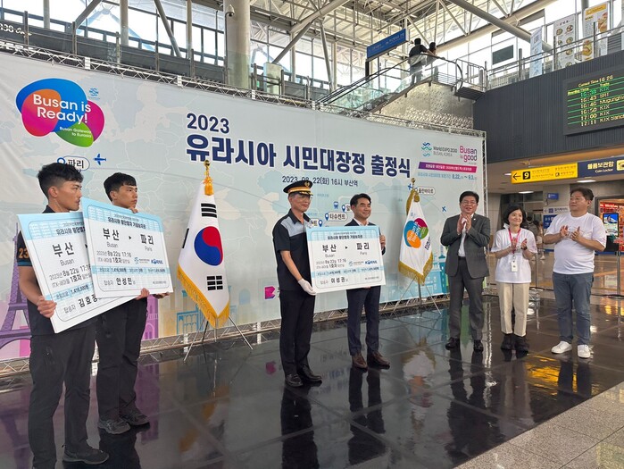 [로컬세계 부산=맹화찬 기자]한국철도공사(코레일) 부산경남본부와 부산시, 부산글로벌도시재단은 22일 부산역에서 ‘2023 유라시아시민대장정 출정식’을 개최했다고 밝혔다.