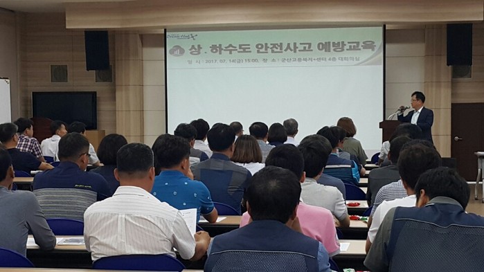 [로컬세계 양해수 기자]전북 군산시 수도사업소에서는 14일 상·하수도관련 공무원 및 시공사, 감리원, 운영사(시설물관리자)등의 현장근무자들을 대상으로 상·하수도 안전사고 예방교육을 실시했다고 밝혔다.