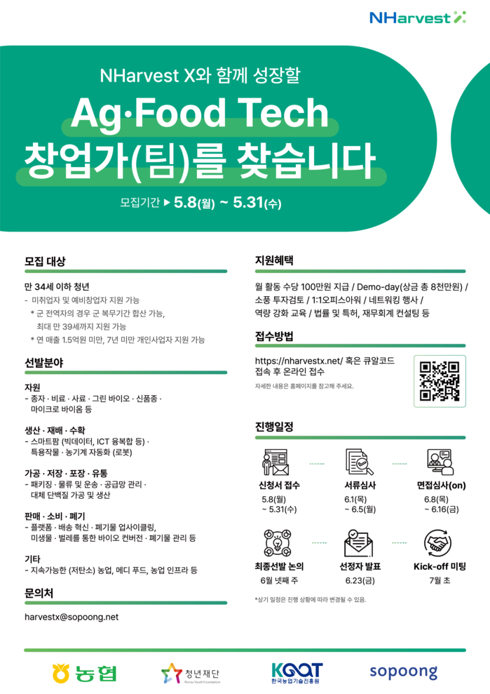 한편, 농협은 ‘NHarvestX’프로그램 외에도 애그테크분야 취·창업 역량 강화를 위한 창업 기본 교육(NH Seed)을 오는 7월부터 진행할 예정이다.
