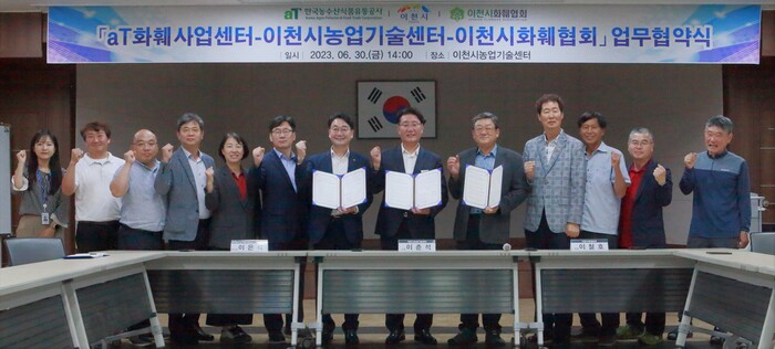 한국농수산식품유통공사(사장 김춘진) 화훼사업센터는 30일 이천시 농업기술센터에서 이천시농업기술센터(소장 이춘석), 한국화훼협회이천시지회(회장 이철호)와 함께 고품질 화훼 생산여건 조성과 판로 안정화를 위한 3자 업무협약을 체결했다.