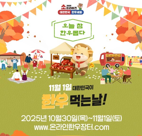 '소프라이즈 2025 대한민국 한우세일'은 10월 28일부터 11월 10일까지 전국 농축협 매장, 대형마트, 한우영농조합법인 등 오프라인 매장과 온라인몰에서 진행된다. 매장별 행사 일정과 품목이 상이하므로 자세한 정보는 한우자조금 홈페이지에서 확인할 수 있다.