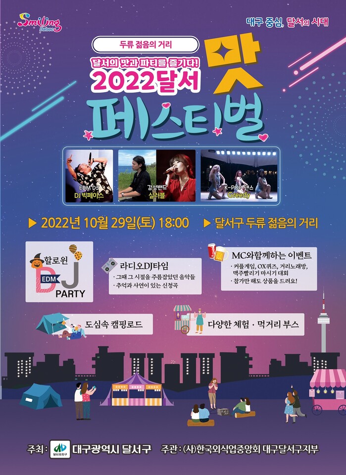 [로컬세계=박세환 기자]대구 달서구는 오는 29일 먹거리 골목 2개소(두류 젊음의 거리, 상화로 먹거리촌)에서 2022 달서‘맛’페스티벌을 개최한다.