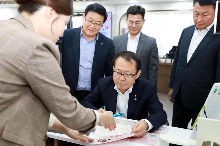 ▲여영현 상호금융대표이사가 영등포농협에서 판매액의 일정 부분이 다양한 사회공헌활동에 쓰이는 사회공헌형 상품 새봄N새희망예금에 가입하고 있다. 농협 제공 |