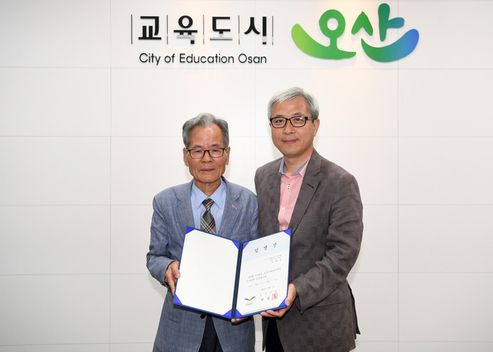 | ▲곽상욱 오산시장(오른쪽)은 지난 3일 사단법인 오산시자원봉사센터의 이사장으로 취임하는 유관진 전 오산시장에게 임명장을 수여했다.(오산시 제공) |