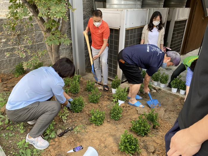 지난 9일 임현준 회장과 장정희 수원시의회 의원, 수원평화나비 회원, 수원시가족여성회관 직원들이 화단에 용담을 심었다.