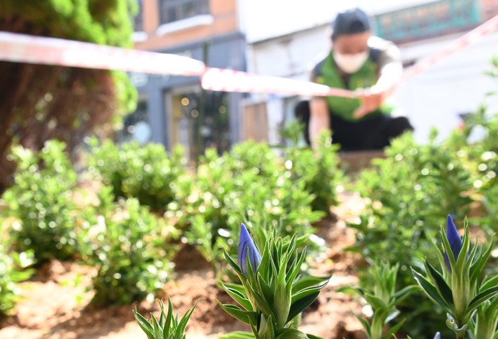 | ▲9일 용담 안점순 기억의 방 주변 화단에 용담을 심고 있다. 수원시 제공 |