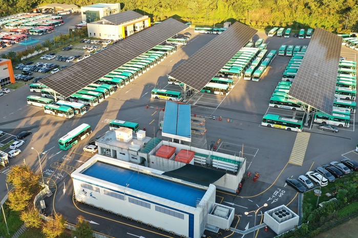 [로컬세계 김병민 기자]경기 수원 동부버스공영차고지에 전기버스 충전기와 태양광발전설비로 이뤄진 ‘친환경 에너지복합시설’이 구축됐다.