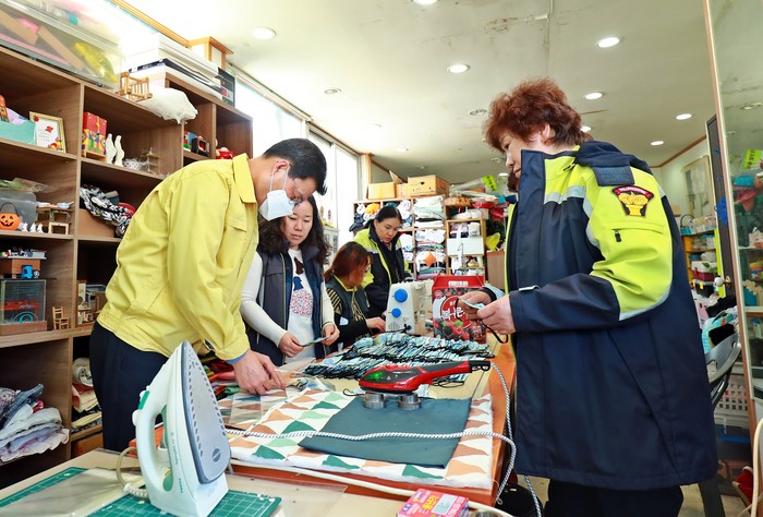 ▲류태호 시장이 여성소방대 회원들의 마스크 제작 현장에 방문해 직접 마스크 제작에 참여하고 있다.(태백시 제공) |