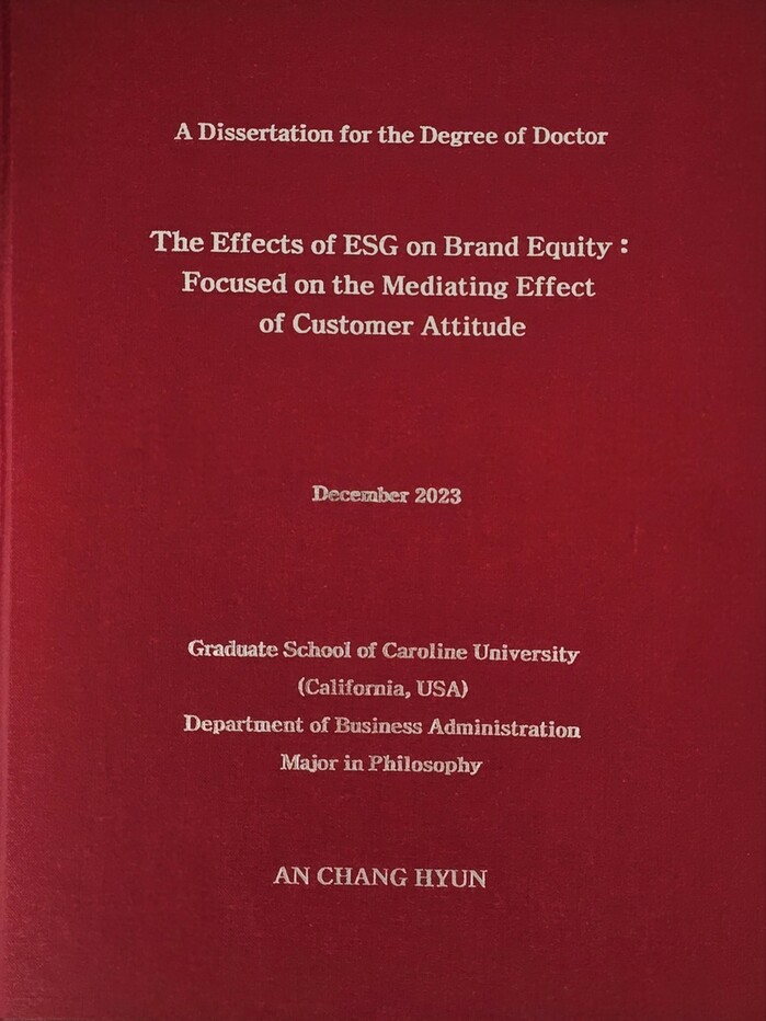 ▲‘기업의 ESG 활동이 브랜드 자산에 미치는 영향: 고객 태도의 매개효과를 중심으로(The Effects of ESG on Brand Equity: Focused on the Mediating Effect of Customer Attitude)’란 안창현 박사(미국 캐롤라인대학교 경영학과)의 논문 표지 |