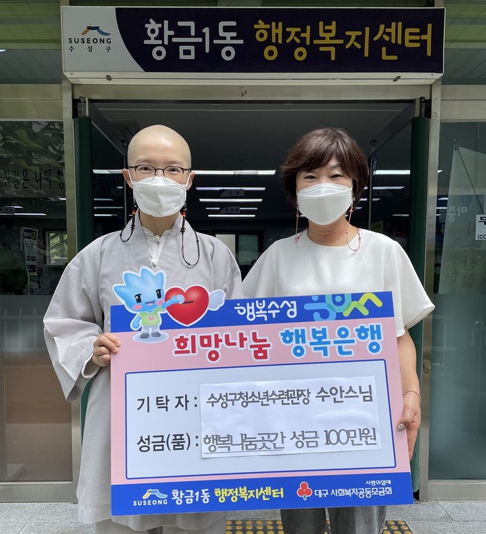 [로컬세계 박세환 기자]대구 수성구 청소년수련관장인 수안스님은 지난 10일 황금1동 행정복지센터를 방문해 취약계층을 위한 성금 100만원을 기부했다.