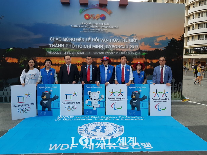 [로컬세계 김재덕 기자]베트남 방문해 문화·경제교류에 나선 UN NGO 세계유통연맹(WDF) 임원들이 지난 11일베트남 호찌민 응우옌후에 거리 특설무대에서 열린 '호찌민-경주세계문화엑스포 2017' 포트존에서 2018 평창동계올림픽을 베트남 시민· 관광객들에게 알리고 있다.