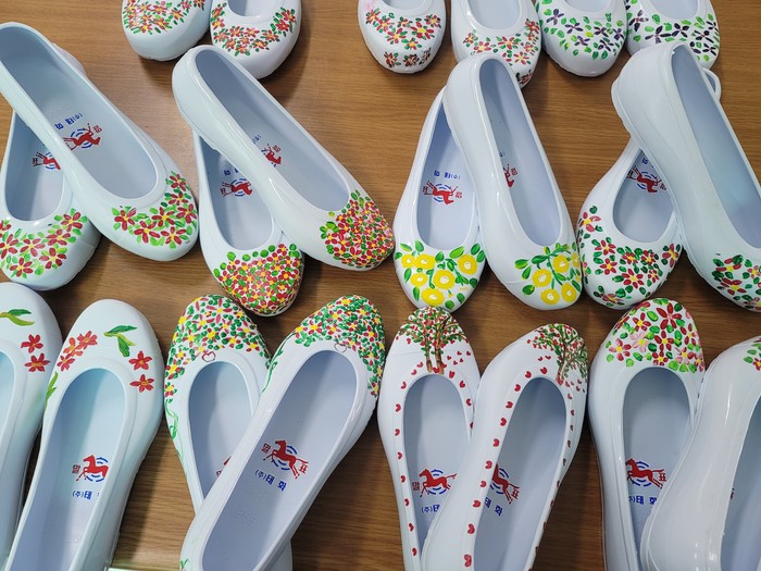 단북면사무소 내 바자회의 물품 준비를 위해 위원들은 한마음 한뜻으로 고무신에 예쁘게 야생화를 그려 단조로웠던 고무신에 생기를 불어 넣은 예술 작품으로 재탄생하게 했다.