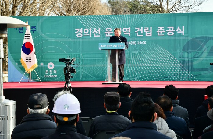 | ▲ 김경일 파주시장이 운천역 준공식 축사를 하고 있다. 파주시 제공 |