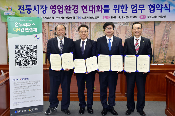 수원시와 IBK기업은행, 수원시상인연합회, ㈜하렉스인포텍은 9일 시청 상황실에서 ‘전통시장 영업환경 현대화를 위한 업무협약’을 체결하고, 모바일 결제 서비스 도입을 위해 적극적으로 협력하기로 했다.