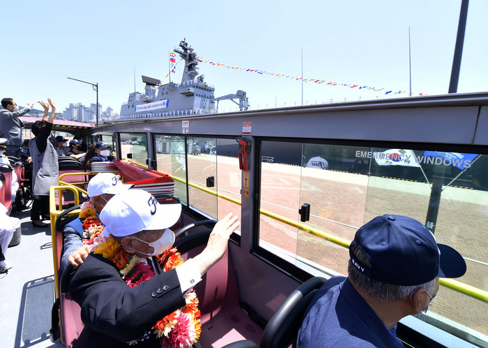 | ▲26일 오전 대한해협해전 참전용사들과 유가족들이 부산작전기지에 정박 중인 독도함 장병들의 환영을 받고 있다. |