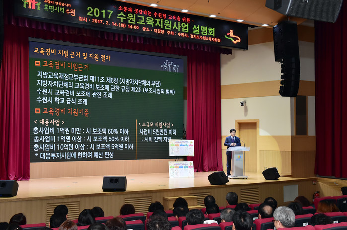 수원시는 14일 수원시청에서 ‘2017 수원교육지원사업 설명회’를 열고, 8개 분야 55개 교육지원사업을 소개했다. 올해 교육지원사업에는 670억 500만 원의 예산이 투입된다.