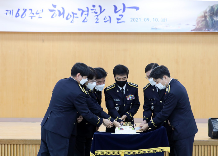▲제68주년 해양경찰의 날을 맞아 박형민 부산해양경찰서장(가운대)과 경찰관들이 케익 커팅식을 하고 있다. 부산해경 제공 |