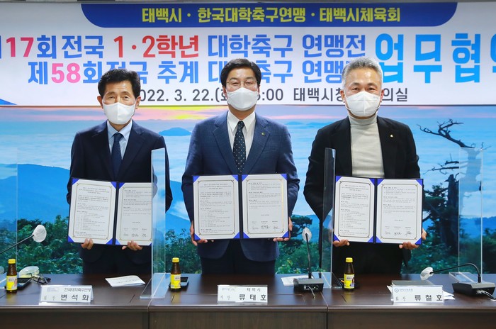 이날 협약식에는 류태호 태백시장, 변석화 한국대학축구연맹 회장, 류철호 태백시체육회장 등을 비롯해 관계자들이 참석한 가운데, 안전하고 성공적인 대회를 치르기 위해 방역 등 대회 운영에 협력하기로 했다.