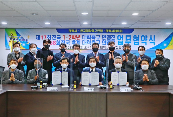 [로컬세계 박상진 기자]강원 태백시와 한국대학축구연맹(회장 변석화)은 22일 오후 4시 시청 소회의실에서 제58회 전국 추계 대학축구연맹전 및 제17회 1, 2학년 전국 대학축구연맹전 개최를 위한 업무협약을 체결했다.