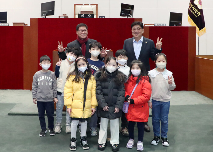 [로컬세계=김병민 기자] 다함께돌봄센터17호점에 다니는 여수초등학교 1·2학년 학생 8명이 9일 오전 성남시의회 홍보관을 견학했다. 방문한 학생들은 박광순 의장과 안광림 의원의 환영 인사를 받았다.